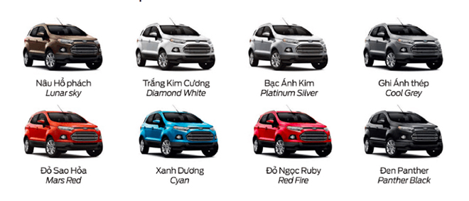 Các màu sơn ngoại thất của Ford EcoSport 2020 gồm (8 màu): Xanh dương, Đỏ đồng, Trắng kim cương, Bạc ánh kim, Nâu hổ phách, Đỏ ngọc ruby, Đen, Ghi ánh thép.