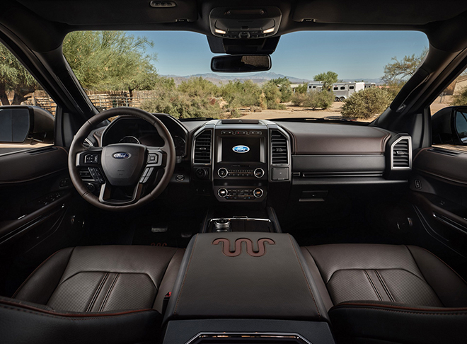 Nội thất Ford Expedition cung cấp chỗ ngồi rộng rãi cho 7 hàng khách với hàng ghế sau thích hợp cho hai người lớn theo “chuẩn Mỹ”. Trang bị ghế bọc da, ốp gỗ thật, bên cạnh khá nhiều “đồ chơi” cao cấp như loa B&O, màn hình hỗ trợ lái kiểu analog kết hợp với màn hình 4,2 inch, màn hình giải trí trung tâm 8 inch, cửa sổ trời cỡ lớn. Cung cấp điểm truy cập WiFi, tính năng khởi động động cơ từ xa, sưởi vô lăng, kiểm soát tiếng ồn chủ động và hơn nữa.