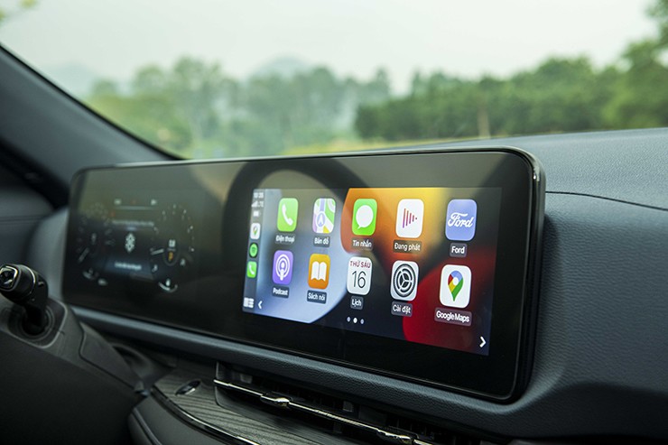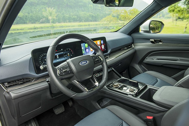 Không gian nội thất Ford Territory 2024 bài trí tinh tế, sang trọng và tiện nghi. Tất cả các chi tiết trên bề mặt táp-lô được tối giản hết mức và tập trung vào cặp màn hình kép thời thượng có kích thước 12 inch, cùng đặt trong một mặt kính. Trong đó, màn hình giải trí trung tâm kết nối Apple CarPlay/Android Auto không dây, nhưng không dùng SYNC.