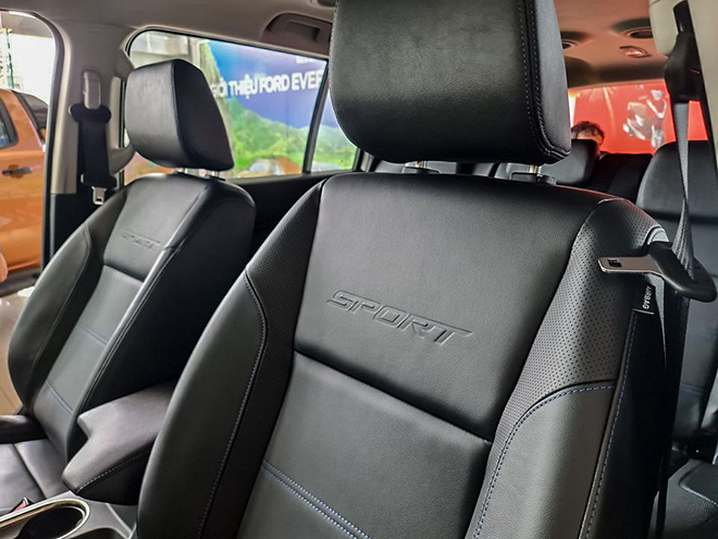 Bên trong khoang nội thất Ford Everest Sport, ghế và táp-lô bọc da với điểm nhấn là các đường chỉ thêu màu xanh dương, phong cách tương đồng với mẫu bán Ranger Raptor. Ngoài ra, hàng ghế phía trước cũng có thêm chữ “Sport” được dập ở phần tựa lưng.